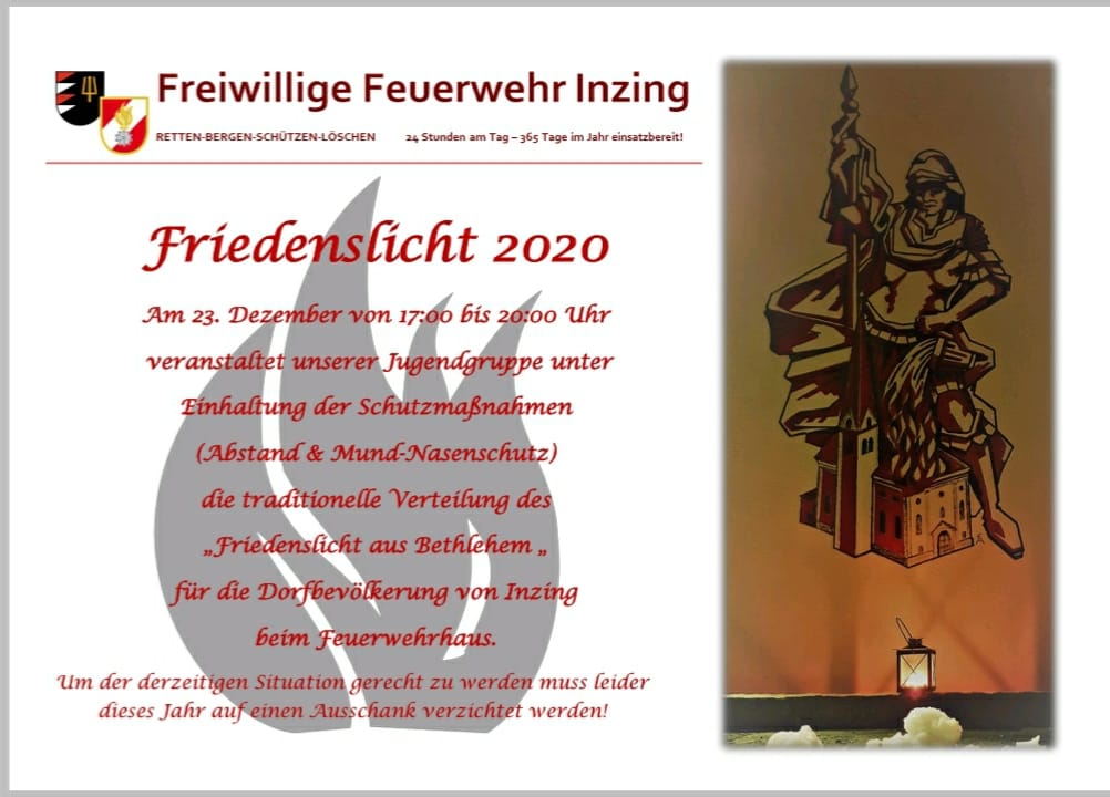 Am 23. Dezember von 17:00 bis 20:00 Uhr veranstaltet unserer Jugendgruppe unter Einhaltung der Schutzmaßnahmen (Abstand & Mund Nasenschutz) die traditionelle Verteilung des „Friedenslicht aus Bethlehem” für die Dorfbevölkerung von Inzing beim Feuerwehrhaus.🚒